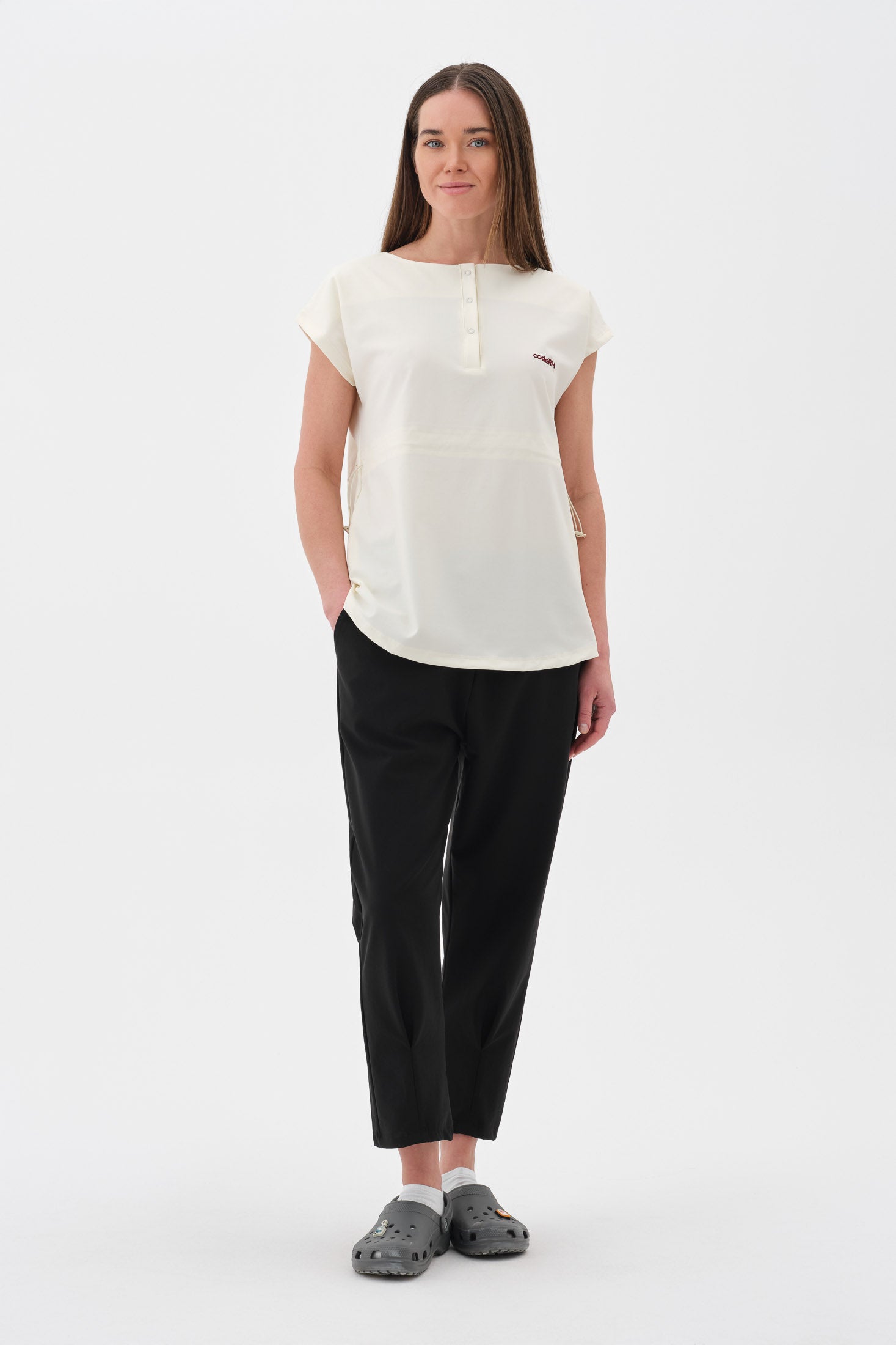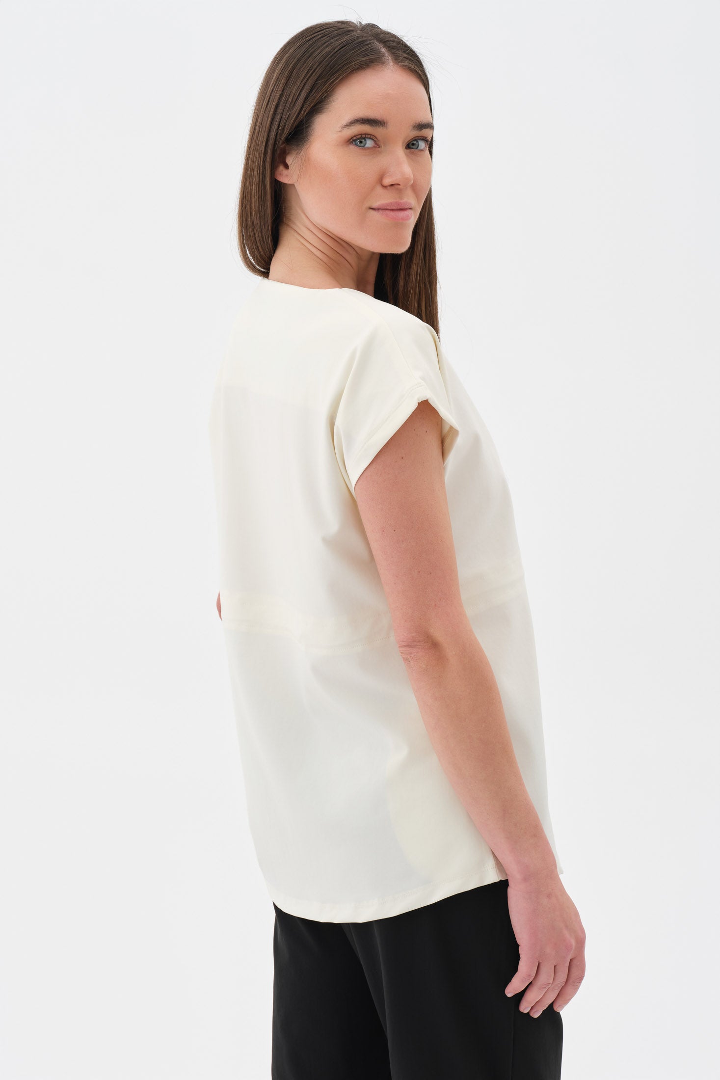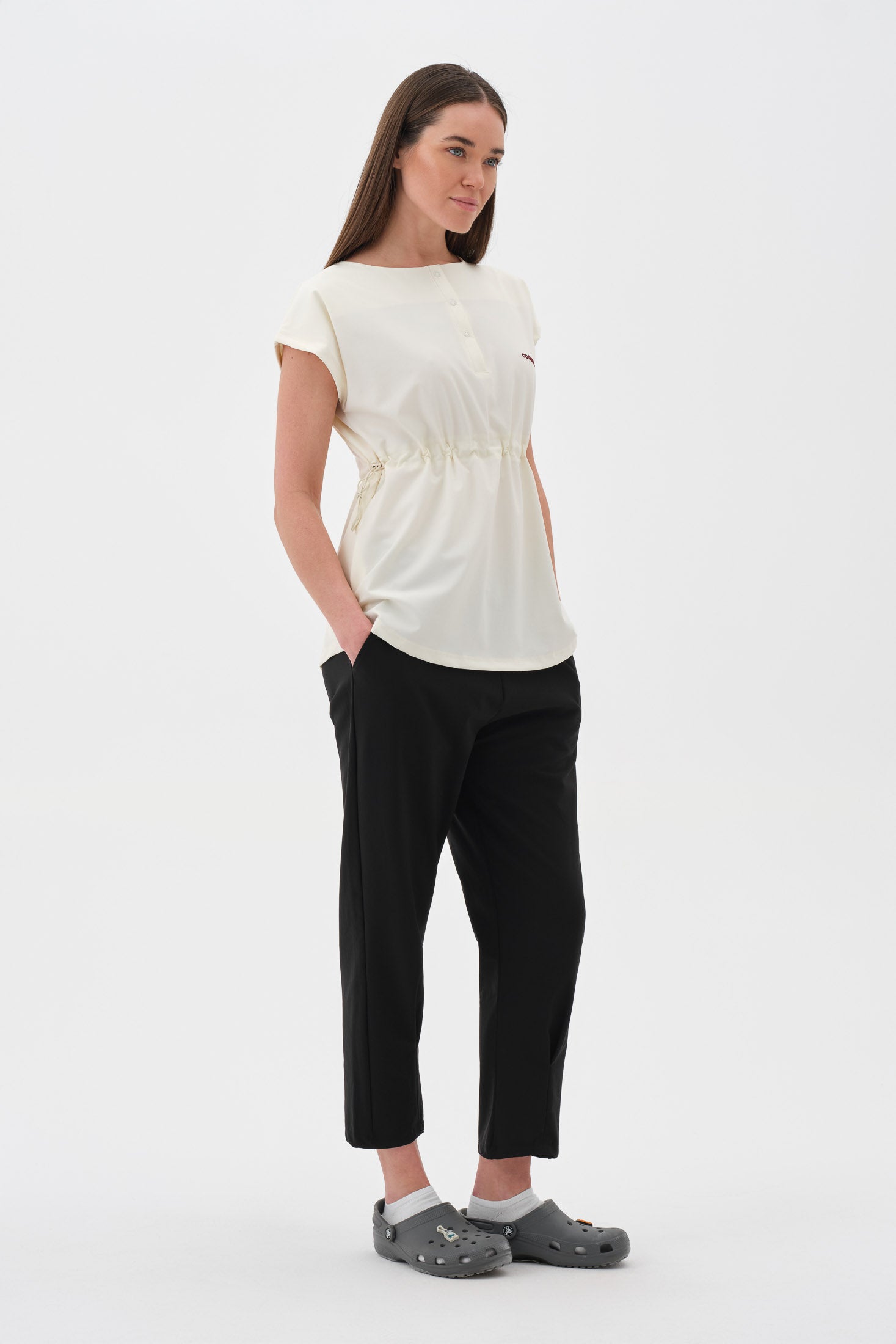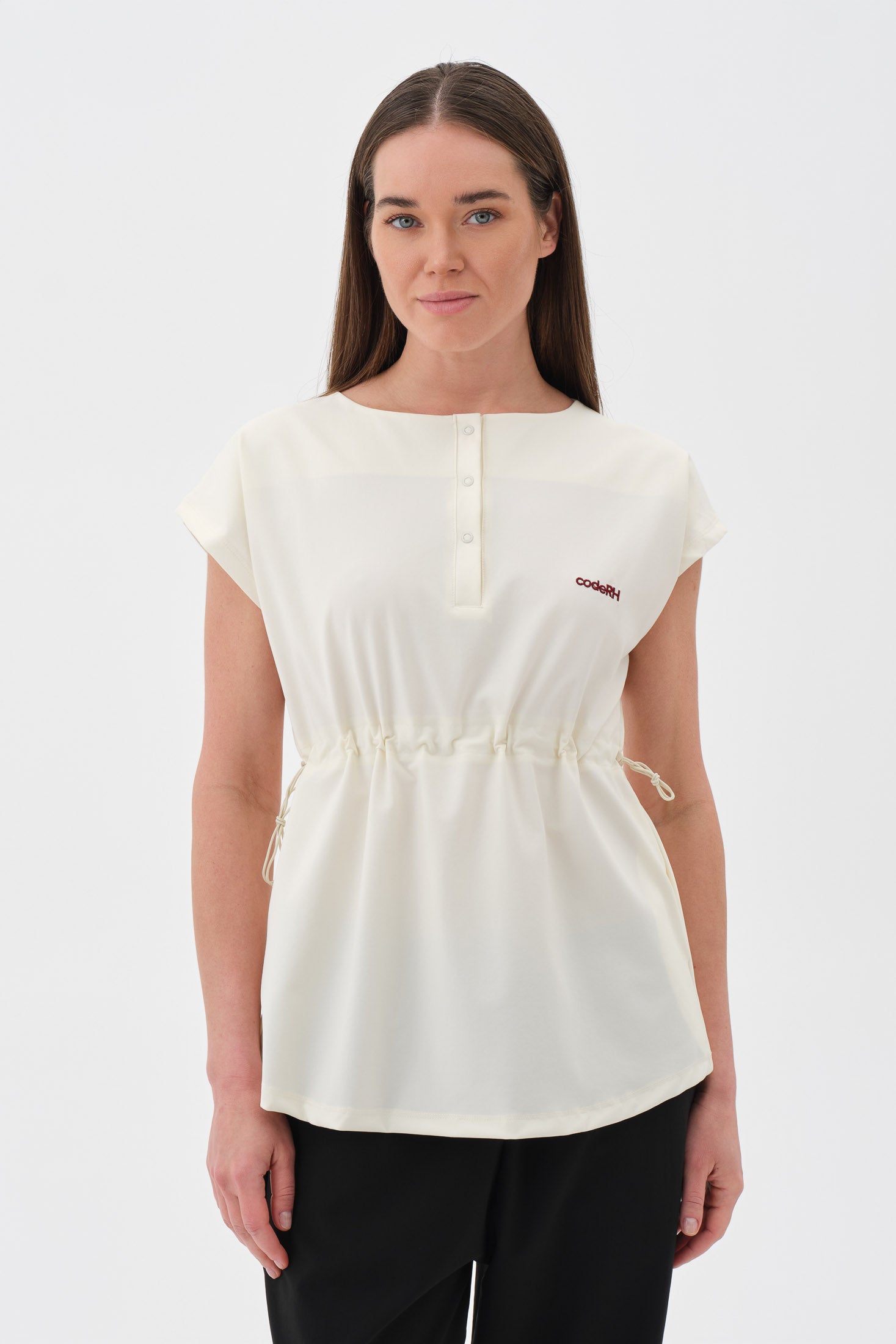 Şıklığı ve fonksiyonelliği bir arada sunan modern tasarım. Yakada yer alan ayarlanabilir çıtçıt detayları, yaka genişliğini isteğe göre düzenleme imkânı sunarak hem zarif bir görünüm hem de kişisel konfor sağlar. Aynı zamanda giyip çıkarmayı kolaylaştırır. Rahat kesim kısa kol yapısı, omuz hareketlerini kısıtlamaz ve gün boyu ferah bir kullanım sunar.