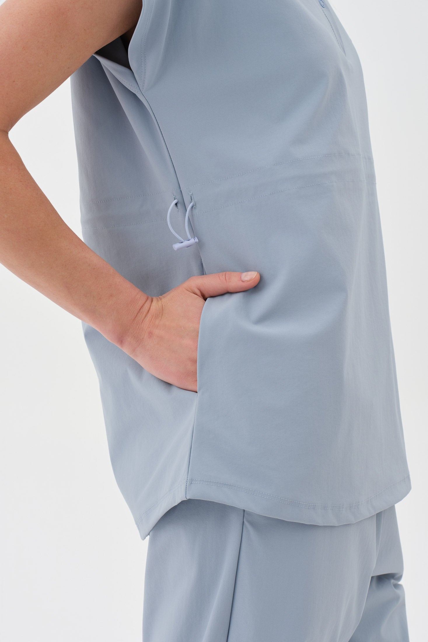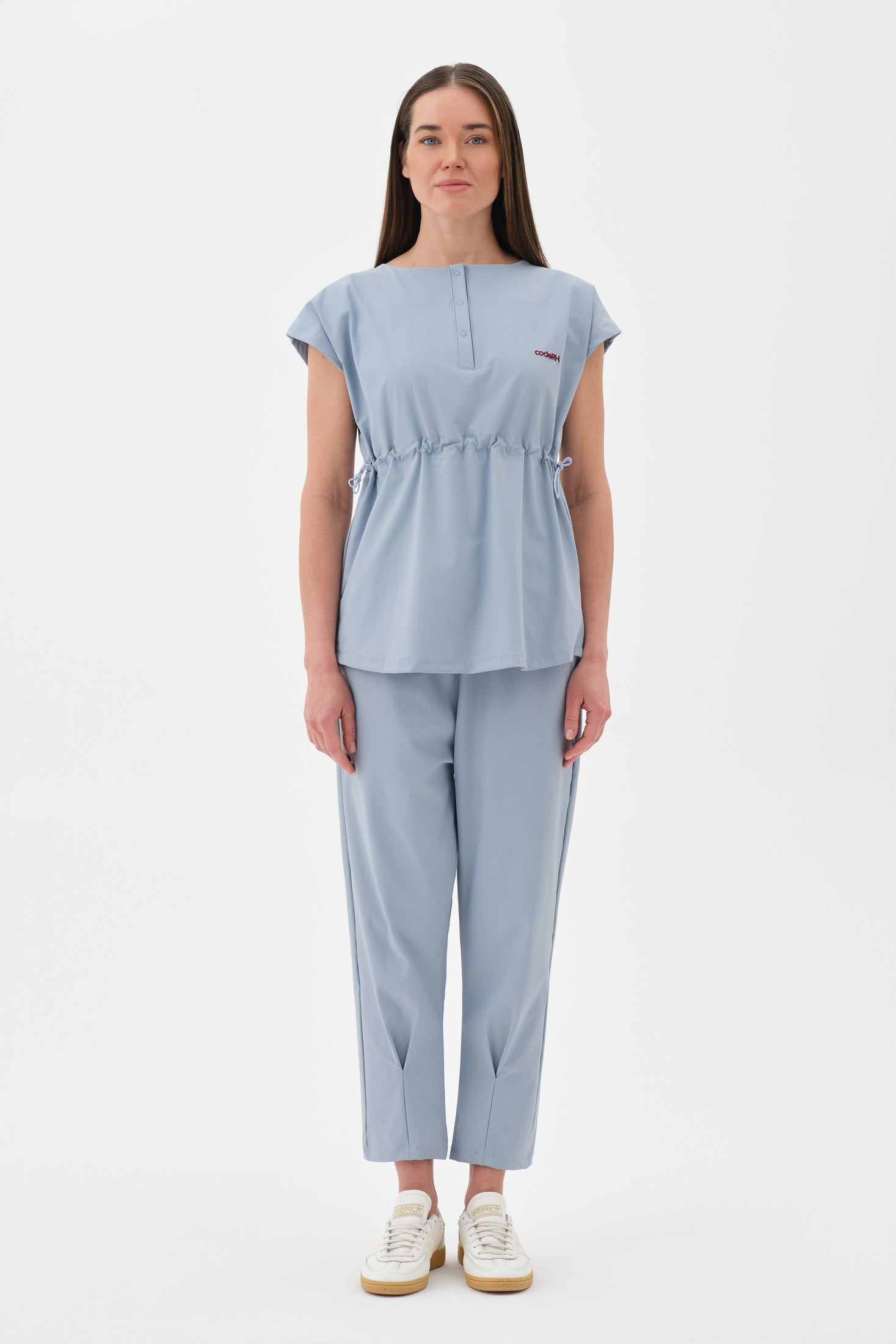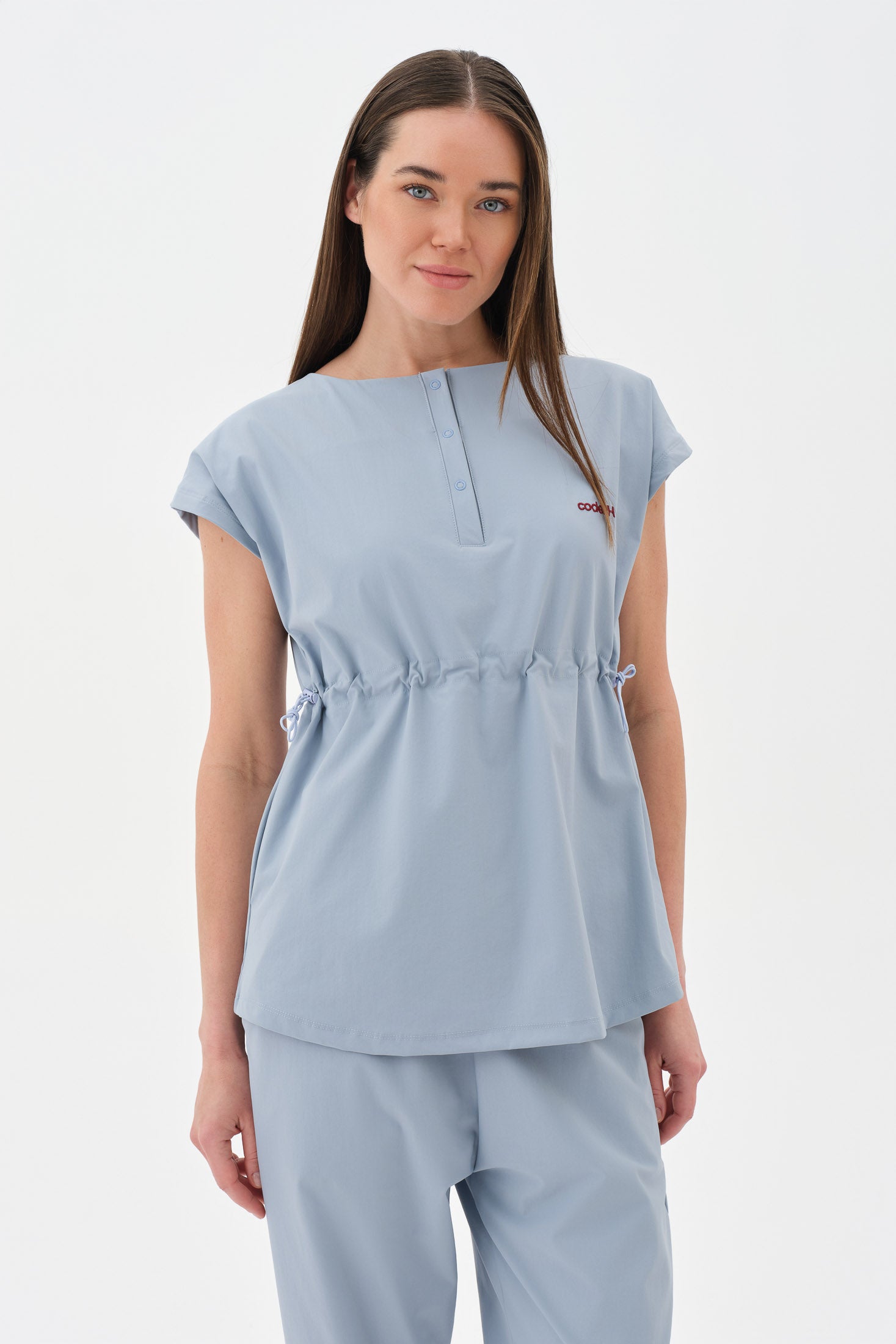 Şıklığı ve fonksiyonelliği bir arada sunan modern tasarım. Yakada yer alan ayarlanabilir çıtçıt detayları, yaka genişliğini isteğe göre düzenleme imkânı sunarak hem zarif bir görünüm hem de kişisel konfor sağlar. Aynı zamanda giyip çıkarmayı kolaylaştırır. Rahat kesim kısa kol yapısı, omuz hareketlerini kısıtlamaz ve gün boyu ferah bir kullanım sunar.